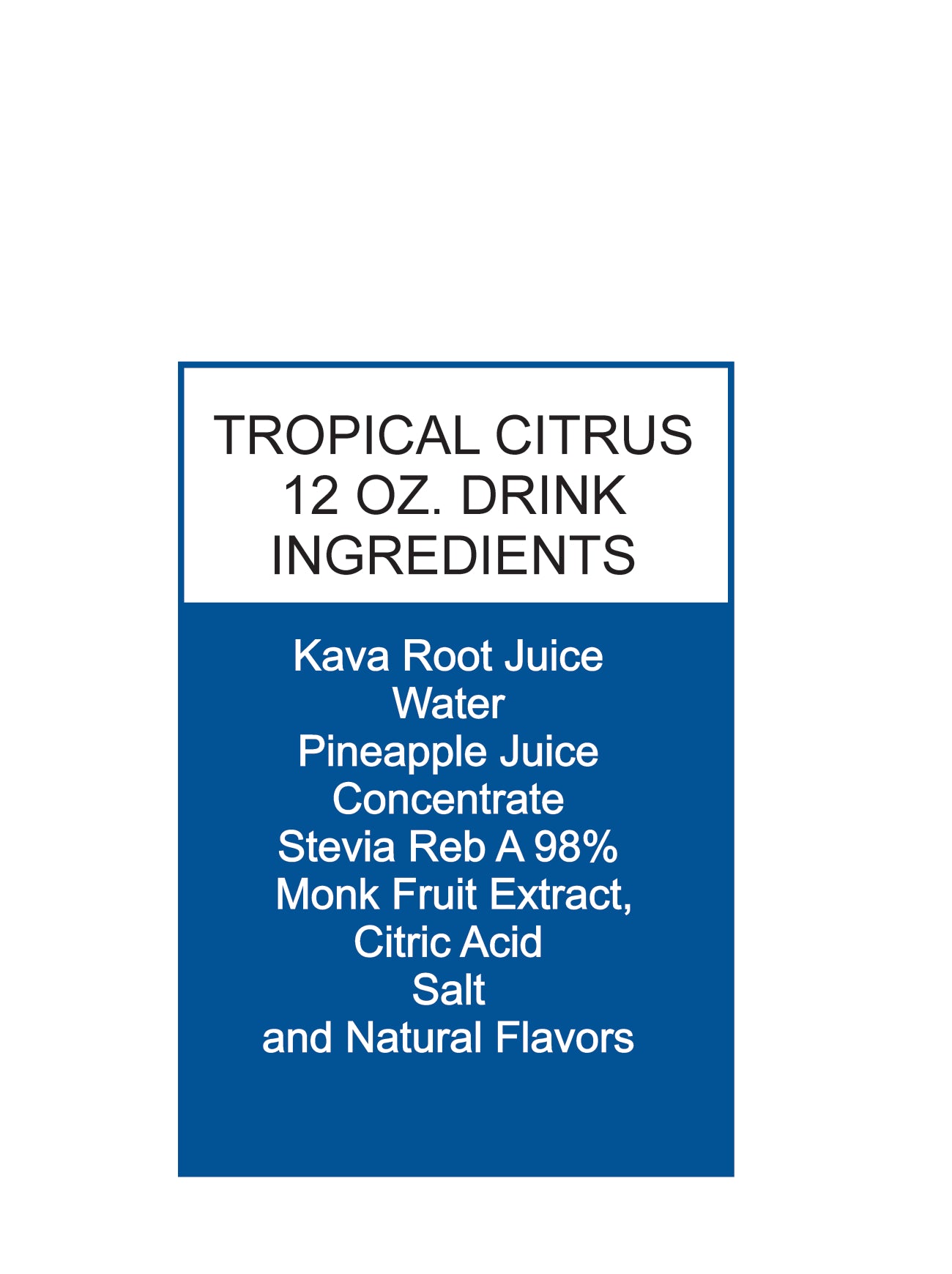 INGREDIENTS: TRU KAVA Tropical Citrus: Kava Root Juice, Water, Pineapple Juice Concentrate, Stevia Reb A 98%, Monk Fruit Extract, Citric Acid, Salt and Natural Flavors.